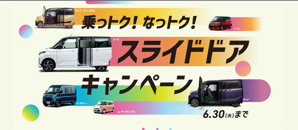 平素より東海車輛サービスをご愛顧いただき、誠にありがとうございます。 このたび、「用品プレゼント・スライドドアキャンペーン」 を開催いたします。 お得なこの機会をぜひご利用ください。 開催期間 2026年4月1日~6月30日 取扱車種の詳細はこちら 用品プレゼント! スライドドアキャンペーン 皆さまのご来店を心よりお待ちしております。
